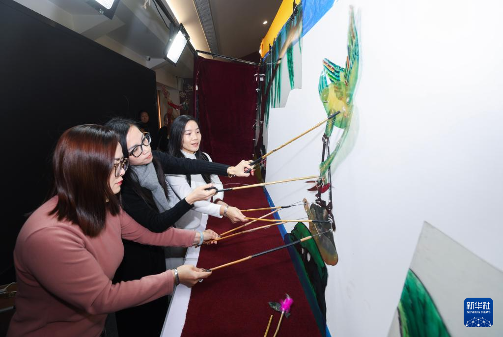 12月21日,在杭州市临平区塘栖镇的共富年货节上,工作人员在非遗皮影文化体验区表演皮影。