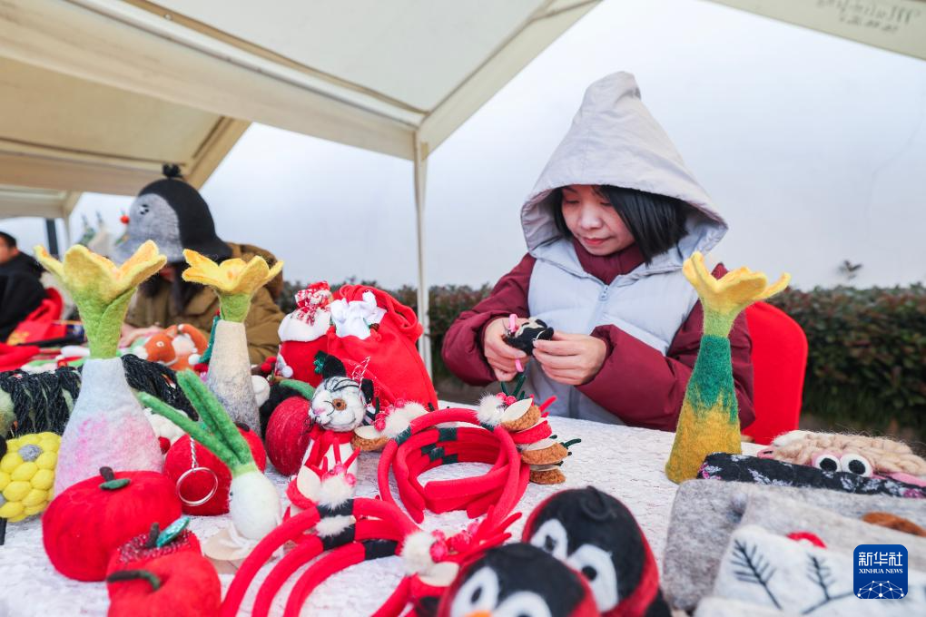 12月21日,在杭州市临平区塘栖镇的共富年货节上,共富工坊工作人员在制作羊毛毡作品。