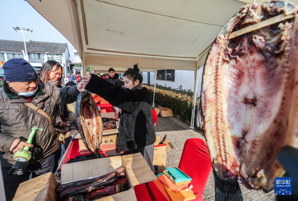 12月21日,游客在杭州市临平区塘栖镇的共富年货节上选购特色农副产品。