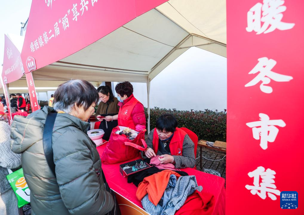 12月21日,在杭州市临平区塘栖镇的共富年货节上,志愿者在志愿服务体验区为当地居民缝补衣物。