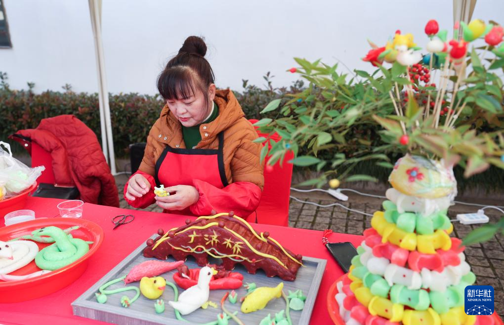12月21日,在杭州市临平区塘栖镇的共富年货节上,共富工坊工作人员在制作水乡特色米塑作品。