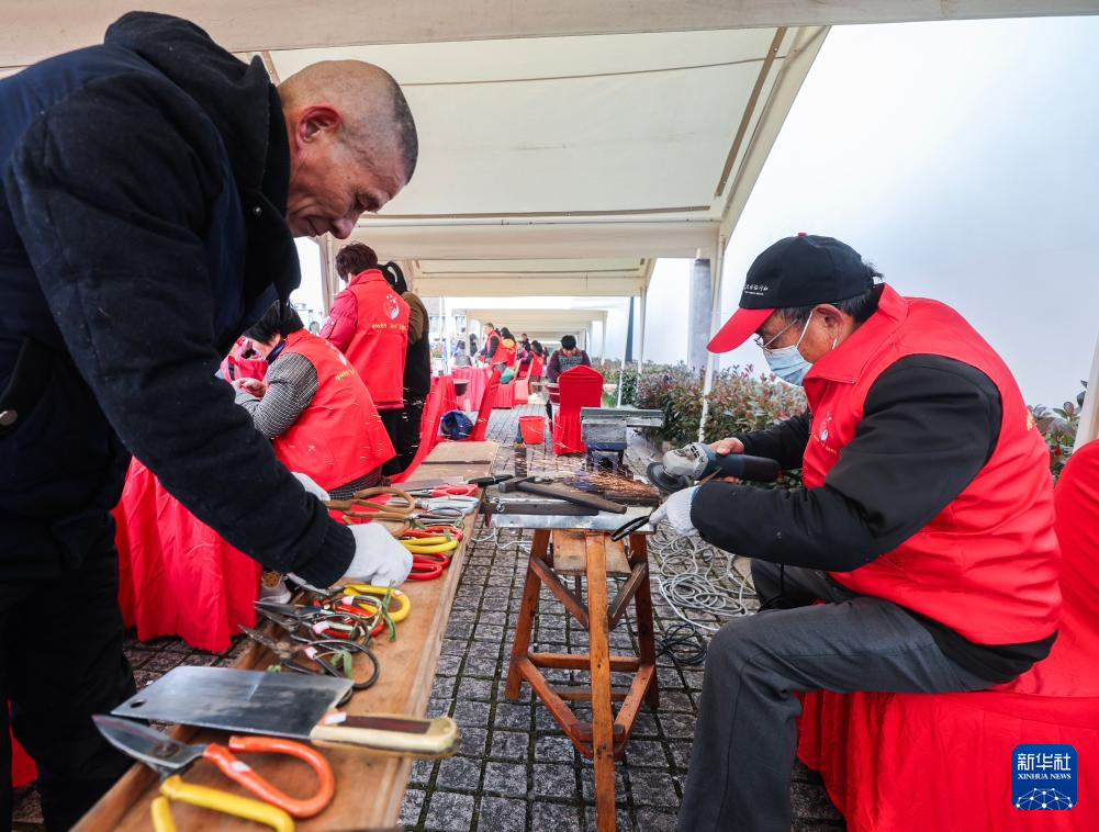 12月21日,在杭州市临平区塘栖镇的共富年货节上,志愿者在志愿服务体验区为当地居民义务磨刀、剪。