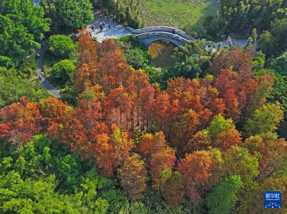随着天气转冷,广西南宁市多个公园的杉树树叶愈发红艳,分外靓丽。