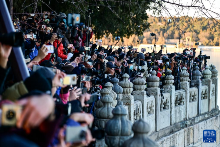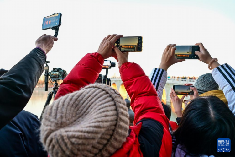 12月22日,游客在颐和园拍摄“金光穿洞”景象。