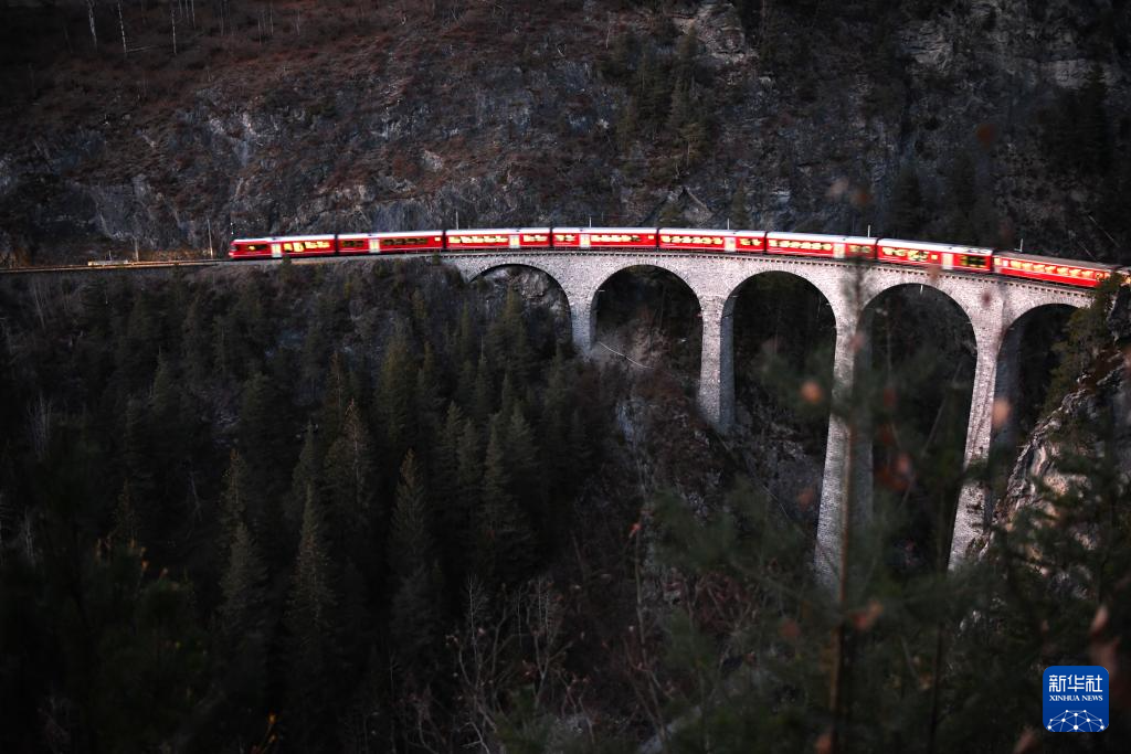 12月1日,行驶在阿尔布拉-贝尔尼纳铁路上的列车经过兰德瓦瑟高架桥。