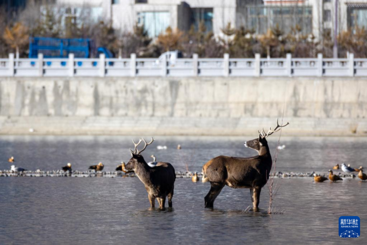 12月23日,两只亚成体雄性白唇鹿出现在流经拉萨城区的拉萨河中。
