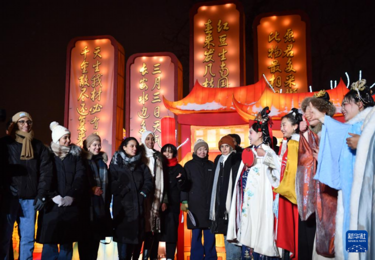 在西安市大明宫国家遗址公园举办的2024大明宫上元唐宫灯会,来自多个国家的留学生与身着传统服饰的演员交流(2月2日摄)。