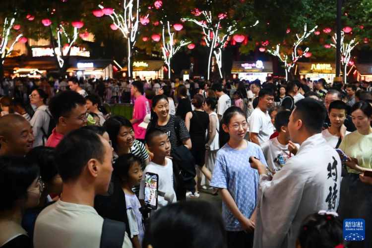游客在西安大唐不夜城步行街参与街头对诗(7月9日摄)。