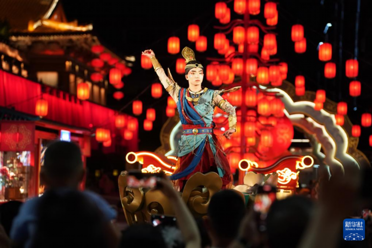 游客在西安大唐不夜城观看表演(5月20日摄)。