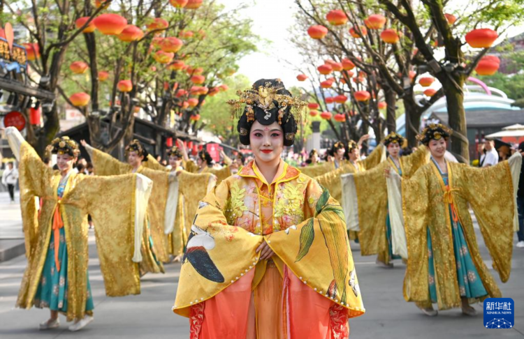 演员在西安大唐不夜城进行“2024长安上巳节”汉服巡游(4月11日摄)。