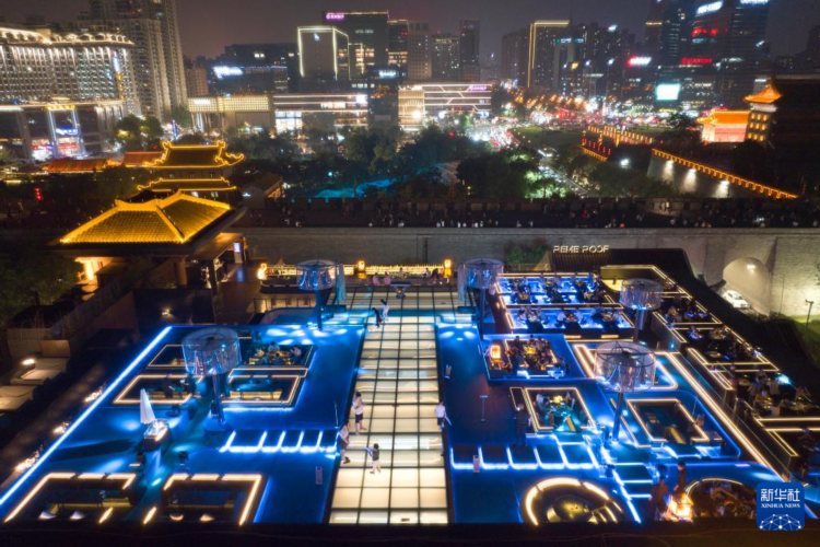 消费者在西安市城墙南门内一家酒吧消费休闲(2023年8月10日摄,无人机照片)。