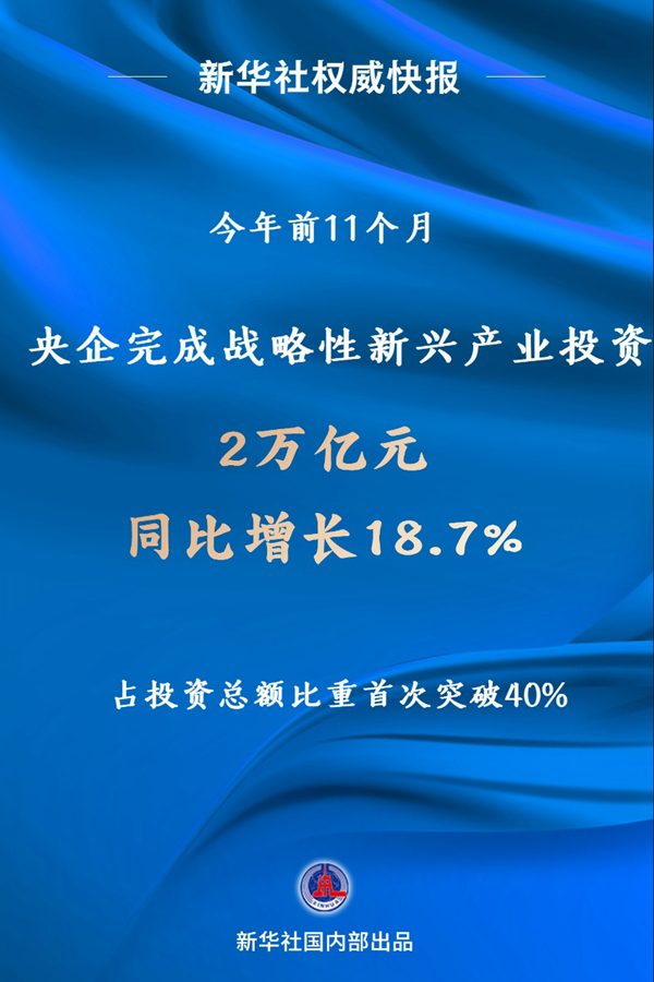 新华社北京12月24日电(记者王希)今年以来,中央企业坚守实体经济,在新兴产业的布局节奏加快,1至11月完成战略性新兴产业投资2万亿元,同比增长18.7%,占投资总额比重首次突破40%。
