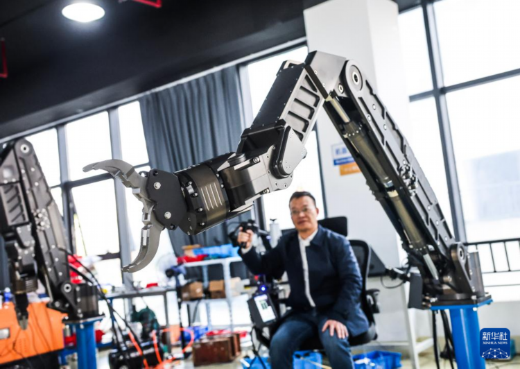 12月24日,在位于金华市金义新区的浙江凯富博科科技有限公司车间内,工作人员测试刚生产的液压机械臂。