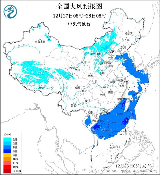 12月27日08时至28日08时,西藏中北部、青海南部、内蒙古中东部、山西、河北北部、山东半岛等地部分地区有5~6级风、阵风7~8级;渤海南部、渤海海峡、黄海大部海域、东海东部和南部海域、台湾海峡、台湾以东洋面、巴士海峡、南海北部和中部海域、北部湾将有7~8级、阵风9~10级的大风。