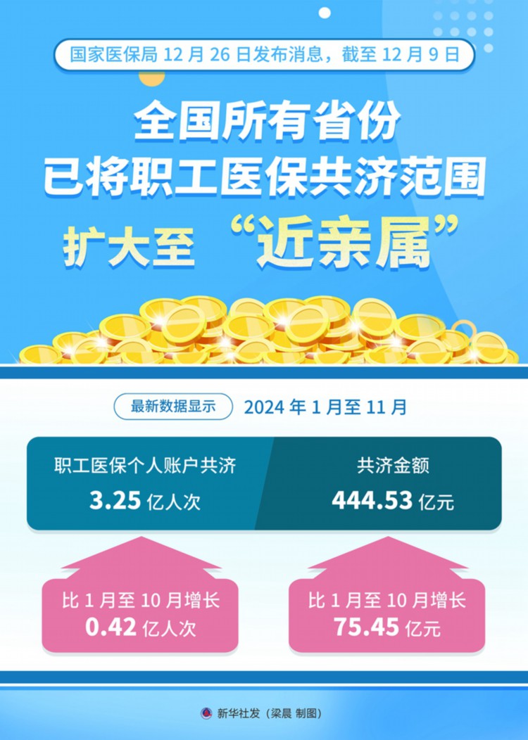 新华社北京12月26日电(记者温竞华、徐鹏航)国家医保局26日发布消息,截至12月9日,全国所有省份已将职工医保个人账户共济范围扩大至“近亲属”。参保人可通过线上途径绑定近亲属关系,实现职工医保个人账户的共济。