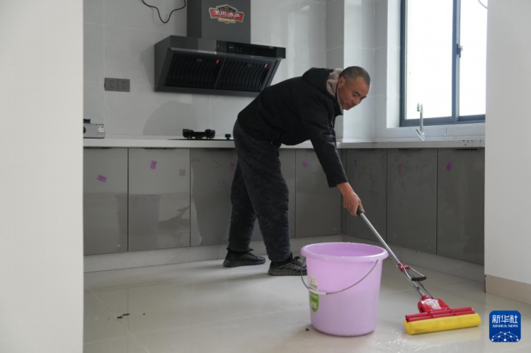 12月25日,在湖南省华容县团洲垸“团洲新村”,一名住户在新房内打扫卫生,为搬家做准备。新华社记者 薛宇舸 摄