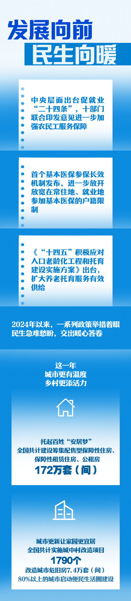 2024年以来,从中央层面出台促就业“二十四条”,到首个基本医保参保长效机制发布,再到聚焦“一老一小”领域扩大养老托育服务有效供给,一系列政策举措着眼民生急难愁盼,书写暖心答卷。