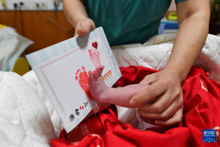 2025年1月1日凌晨,在位于吉林长春的吉林大学白求恩第一医院妇产中心产科,助产士梁平为新生儿印脚印。
