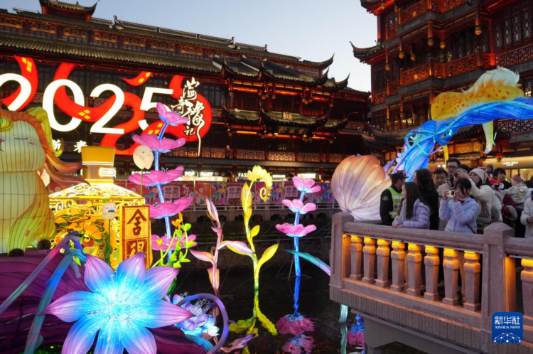 2025年1月1日,人们在豫园九曲桥上赏灯。