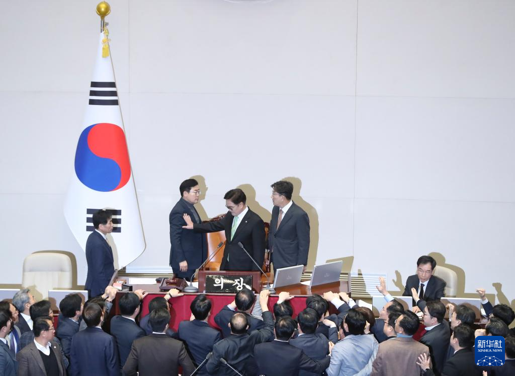 韩国国会通过针对韩德洙的弹劾动议案 12月27日,在韩国首都首尔,一名执政党国民力量党议员与一名在野党议员站在国会议长禹元植(上中)两边发生争执。 韩国国会27日对代行总统职权的国务总理韩德洙的弹劾动议案进行表决,以192票赞成通过该动议案。据韩国媒体报道,韩德洙表示,尊重国会的决定,将等待宪法法院的最终裁决。韩国执政党国民力量党议员没有参加投票,并在投票现场高喊“无效”,表示强烈反对,还要求国会议长禹元植下台。 新华社记者 姚琪琳 摄