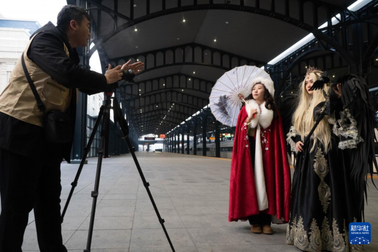 1月2日,在哈尔滨火车站,乘客换完服装准备拍摄。
