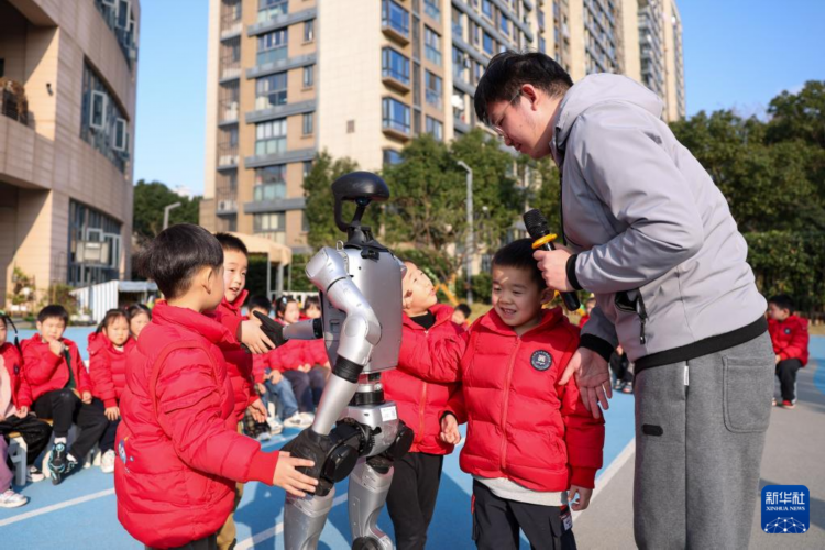 1月2日,宁波工程学院机器人学院科普团成员(右一)为宁波市江北区甬港幼儿园的孩子们介绍人形机器人。