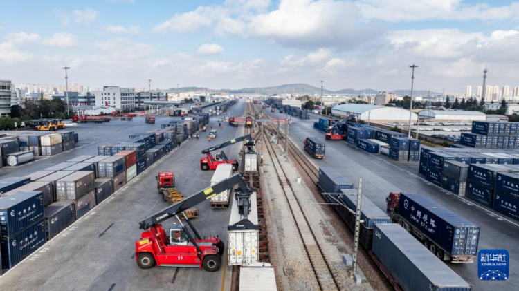 1月2日,中老铁路国际货物列车在云南省昆明市王家营西站进行装箱作业。