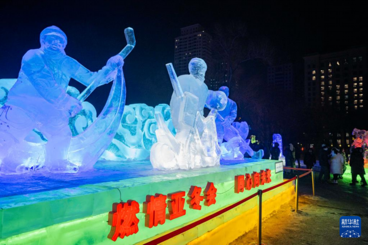 1月2日,在哈尔滨市兆麟公园,游客在冰灯艺术游园会园区内一处2025年哈尔滨亚冬会主题冰灯附近游玩。