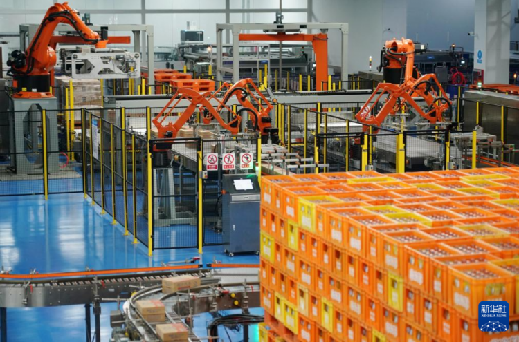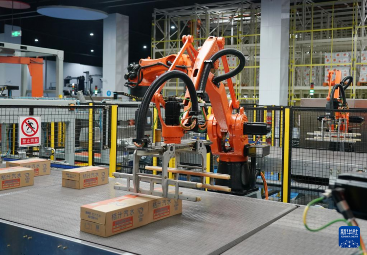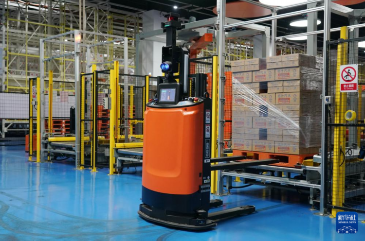 这是2024年11月13日在北冰洋汽水的自动化生产车间内拍摄的智能搬运机器人。新华社记者 张晨霖 摄