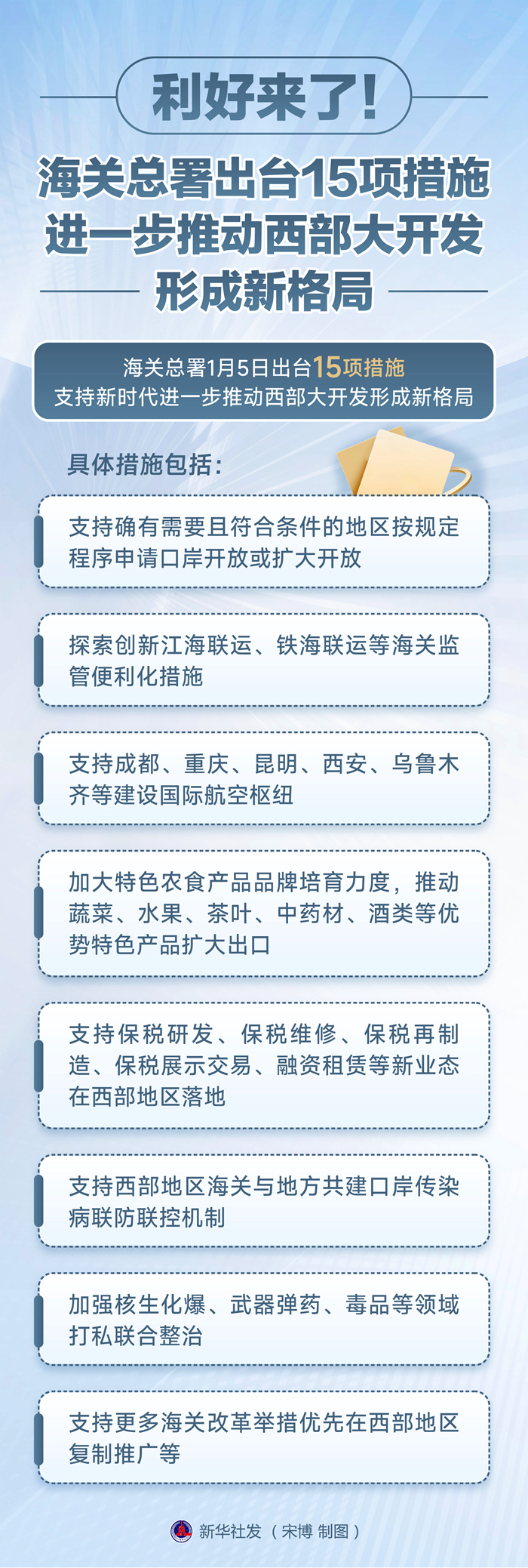 新华社北京1月5日电(记者邹多为)西部地区在全国改革发展稳定大局中举足轻重。围绕以大开放促进大开发、促进特色优势产业发展、筑牢国门安全屏障、支持打造一流口岸营商环境等四个方面,海关总署5日出台15项措施支持新时代进一步推动西部大开发形成新格局。