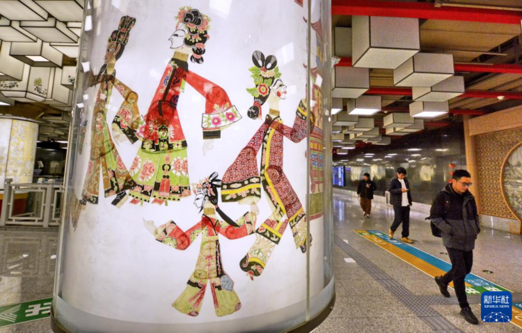 北京地铁19号线平安里站的皮影戏灯箱(1月4日摄)。