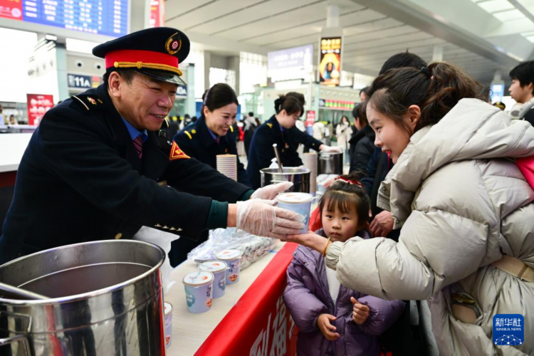 1月6日,在合肥南站候车大厅,工作人员将腊八粥送给旅客。