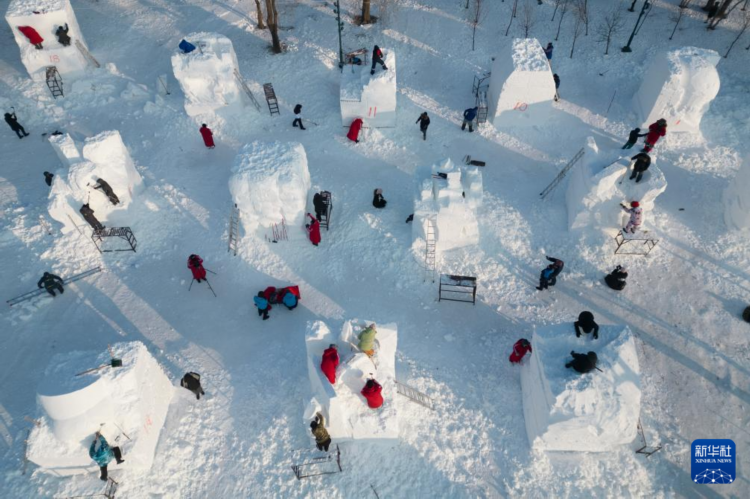 1月6日,参赛选手在哈尔滨太阳岛雪博会园区进行雪雕创作(无人机照片)。
