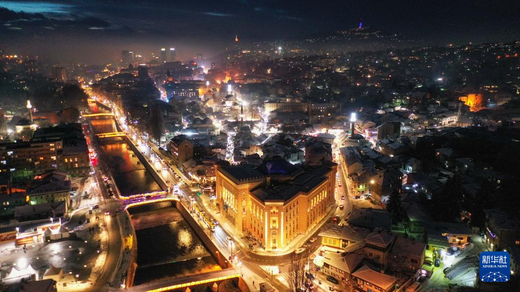 这是1月5日在波黑首都萨拉热窝拍摄的市政厅(下中)及周边景观(无人机照片)。