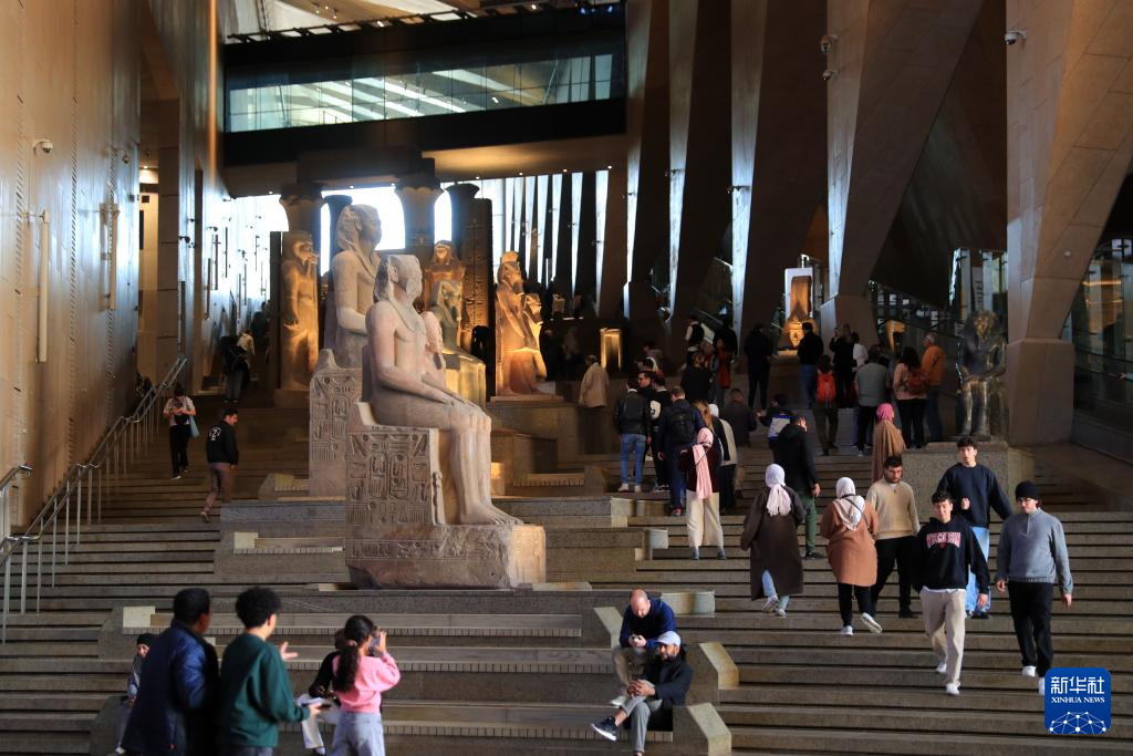 1月2日,游客在埃及吉萨参观大埃及博物馆。