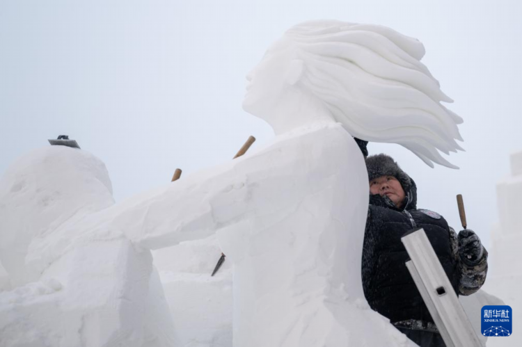 1月7日,参赛选手在太阳岛雪博会园区内进行雪雕创作。