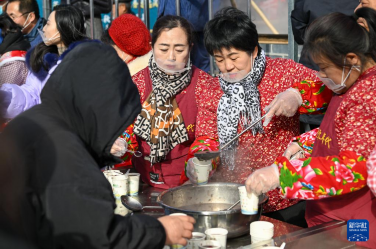 1月7日,在天津芦台大集,工作人员为市民分发腊八粥。