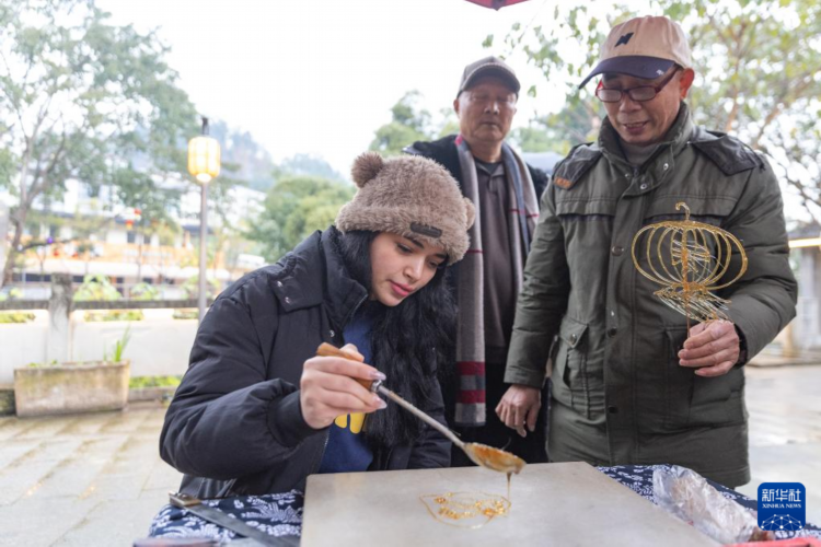 1月7日,在重庆市北碚区偏岩古镇,留学生体验糖画制作。