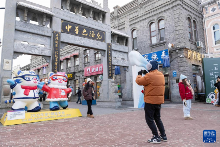 1月8日,在哈尔滨中华巴洛克历史文化街区,游客在亚冬会吉祥物景观前拍照。