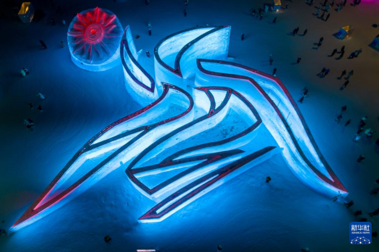 这是1月5日拍摄的亚冬会会徽冰雕(无人机照片)。
