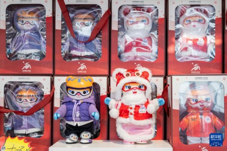 这是1月8日拍摄的哈尔滨一家亚冬会特许零售店内的亚冬会吉祥物纪念品。