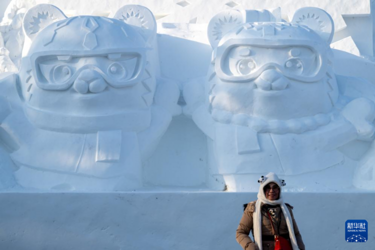 1月8日,在哈尔滨太阳岛雪博会园区,游客在亚冬会吉祥物雪雕前合影留念。