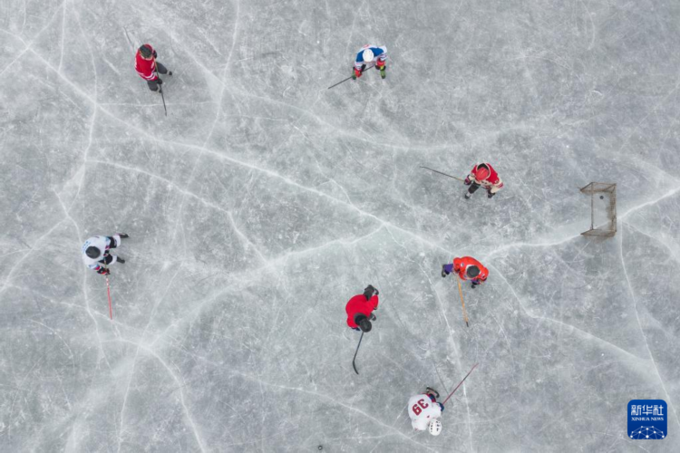1月7日,冰球爱好者在哈尔滨丁香公园的冰面上打冰球(无人机照片)。