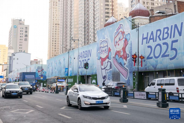 1月8日,在哈尔滨道外区景阳街,车辆驶过巨幅亚冬会宣传画。
