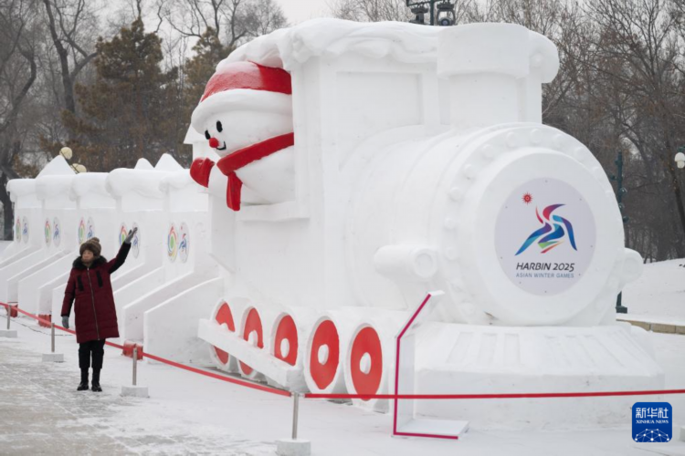 1月7日,在哈尔滨太阳岛雪博会园区,游客与“亚冬列车”雪雕合影。