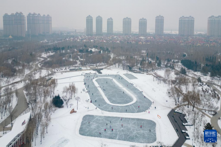1月7日,滑冰爱好者在哈尔滨丁香公园内滑冰(无人机照片)。