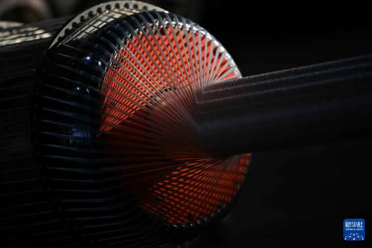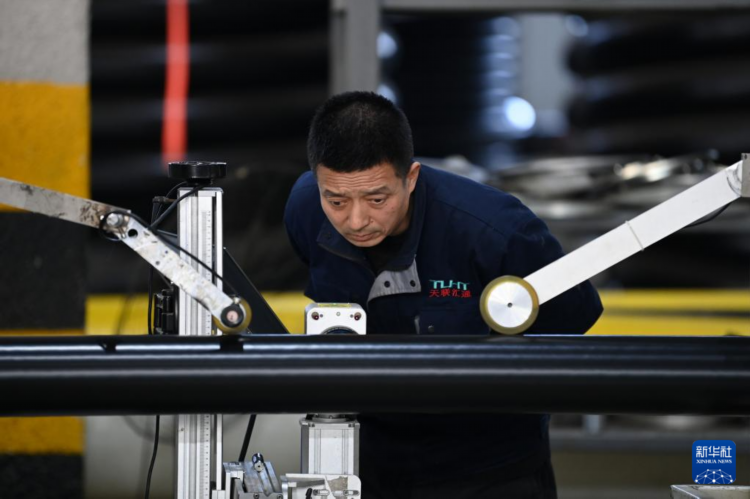 1月7日,在宝鸡天联汇通复合材料有限公司生产车间,工人查看柔性复合高压输送连续管设备运转情况。