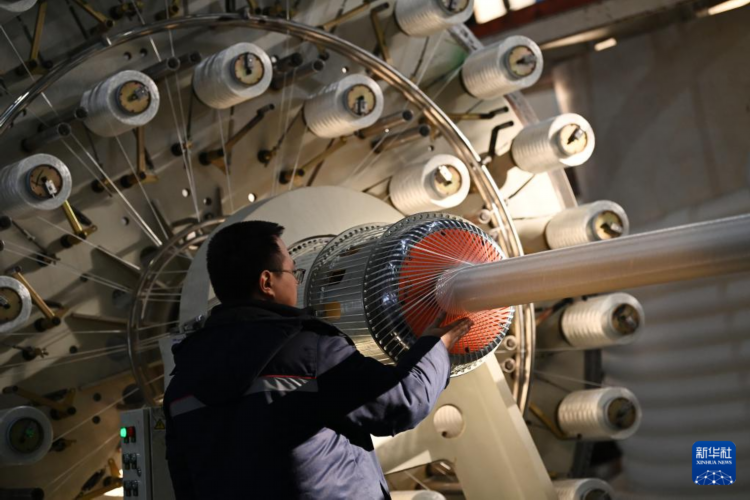1月7日,在宝鸡天联汇通复合材料有限公司生产车间,工人巡查钢纤增强生产过程。