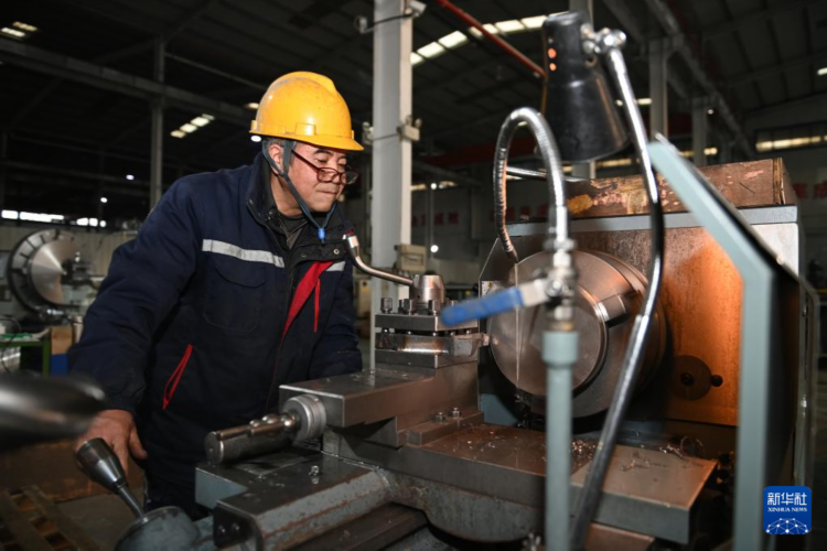 1月7日,在宝鸡市永盛泰钛业有限公司机加车间,工人操作车床加工高速压缩机叶轮钛合金锻件。