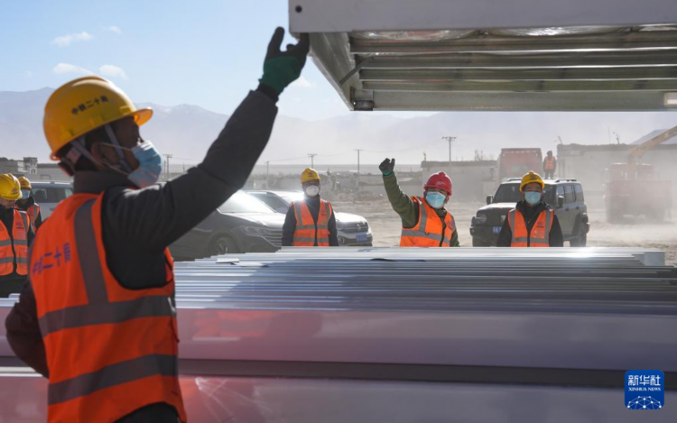 1月9日,在定日地震受灾严重的长所乡等地,各方救援建设者为让受灾群众尽早入住更为舒适的板房,更好地度过冬季,坚持在风沙中施工,抢抓建设进度。